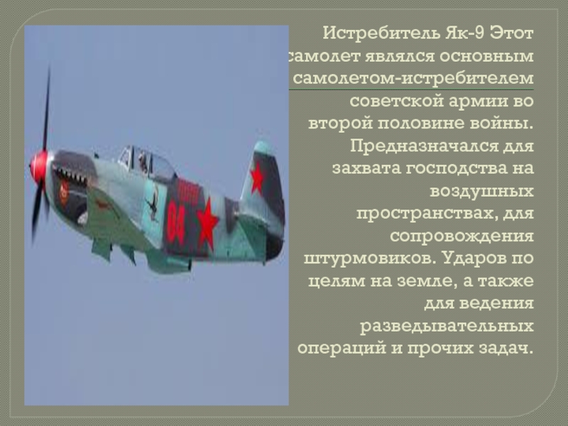 Слайд 12Истребитель Як-9 Этот самолет являлся основным самолетом-истребителем советской армии во второй