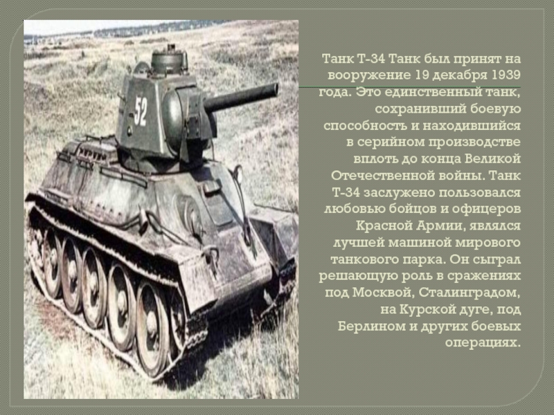 Это единственный танк, сохранивший боевую способность и находившийся в серийном производстве вплоть до конца Великой Отечественной войны. Танк Т-34 заслужено пользовался любовью бойцов и офицеров Красной Армии, являлся лучшей машиной мирового танкового парка. Он сыграл решающую роль в сражениях под Москвой, Сталинградом, на Курской дуге, под Берлином и других боевых операциях.