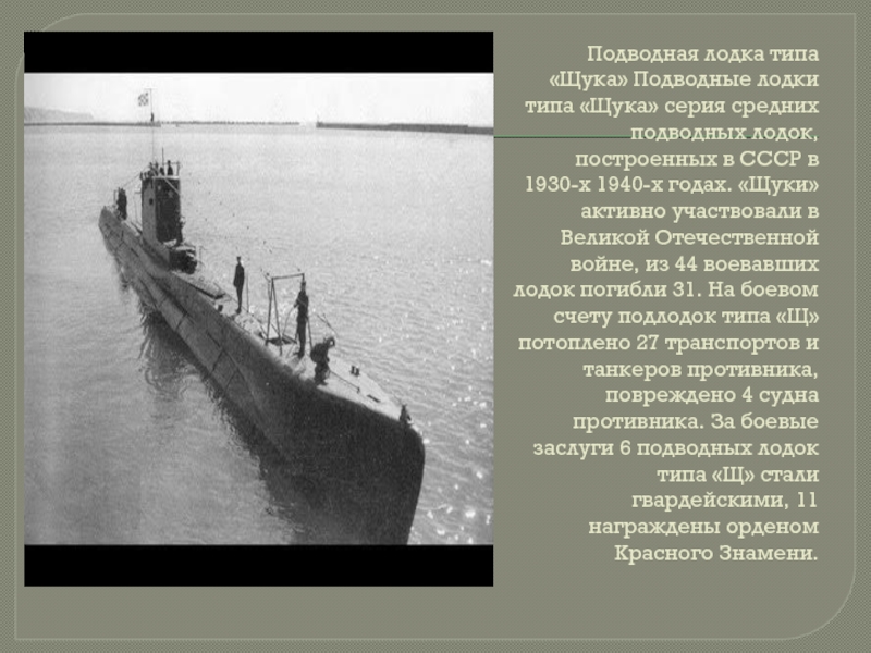 лодок, построенных в СССР в 1930-x 1940-x годах. «Щуки» активно участвовали в Великой Отечественной войне, из 44 воевавших лодок погибли 31. На боевом счету подлодок типа «Щ» потоплено 27 транспортов и танкеров противника, повреждено 4 судна противника. За боевые заслуги 6 подводных лодок типа «Щ» стали гвардейскими, 11 награждены орденом Красного Знамени.