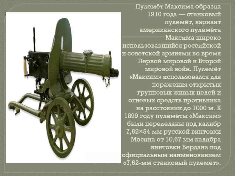 Слайд 14 Пулемёт Максима образца 1910 года — станковый пулемёт, вариант американского пулемёта