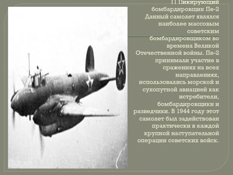 Слайд 1111 Пикирующий бомбардировщик Пе-2 Данный самолет являлся наиболее массовым советским бомбардировщиком