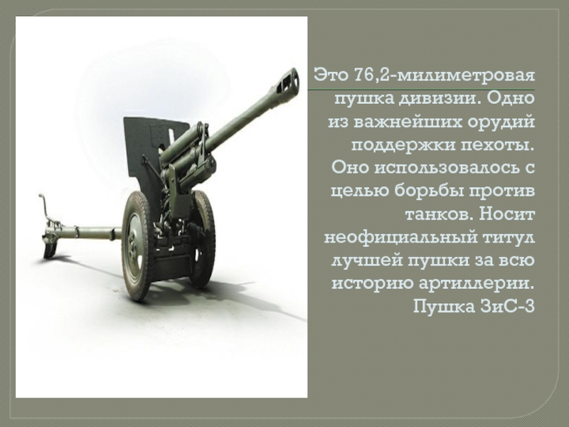 Слайд 4Это 76,2-милиметровая пушка дивизии. Одно из важнейших орудий поддержки пехоты. Оно
