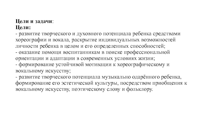 - развитие творческого потенциала музыкально одарённого ребенка, формирование его эстетической культуры, посредством приобщения к вокальному искусству, поэтическому слову и фольклору.