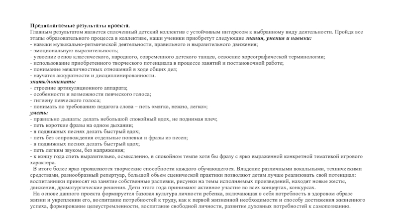 Занятия по данному проекту дают детям возможность социально адаптироваться, получить яркие эмоциональные впечатления от учебно-творческого процесса, от выступлений на концертах и конкурсах как итога личных устремлений, пика артистичности и выразительности, как высшей точки их большой коллективной работы.