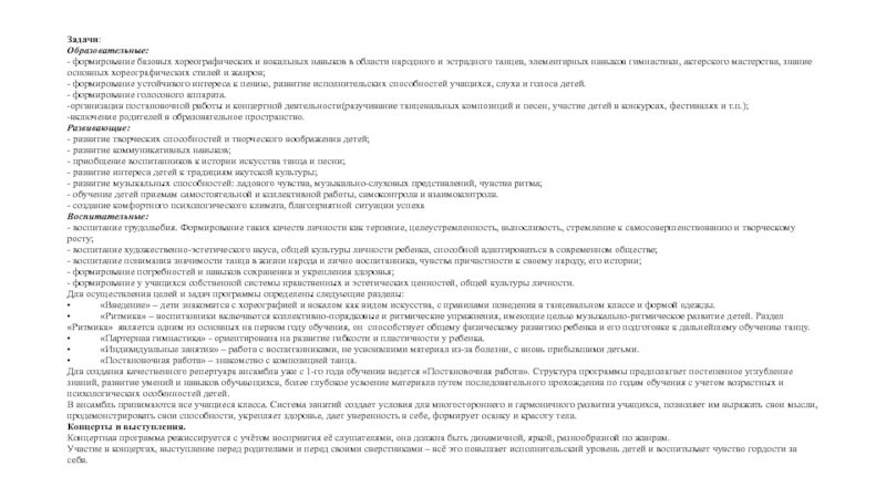 Для создания качественного репертуара ансамбля уже с 1-го года обучения ведется «Постановочная работа». Структура программы предполагает постепенное углубление знаний, развитие умений и навыков обучающихся, более глубокое усвоение материала путем последовательного прохождения по годам обучения с учетом возрастных и психологических особенностей детей.