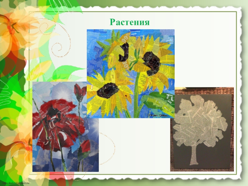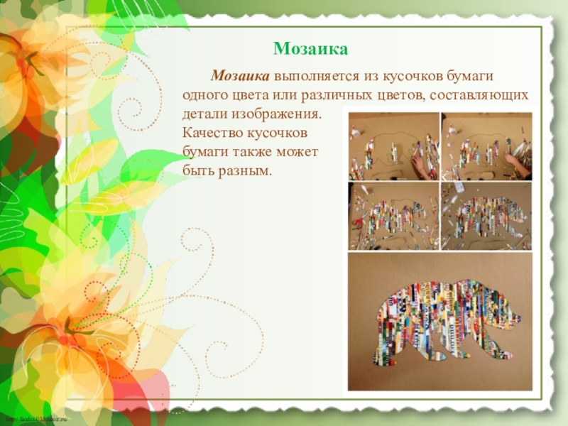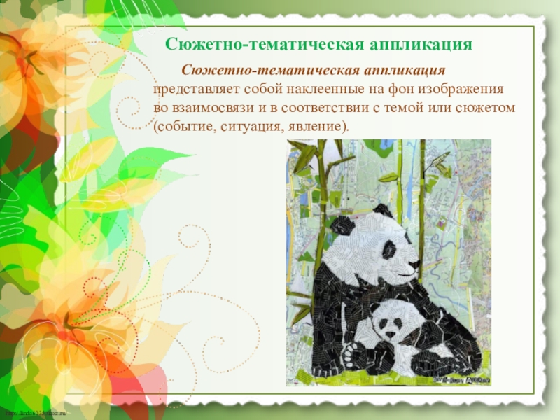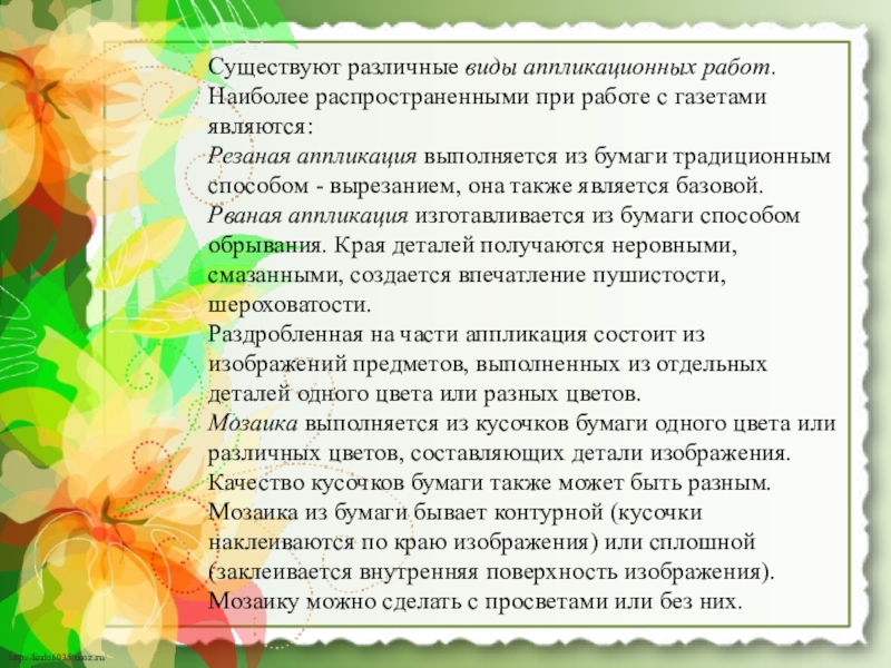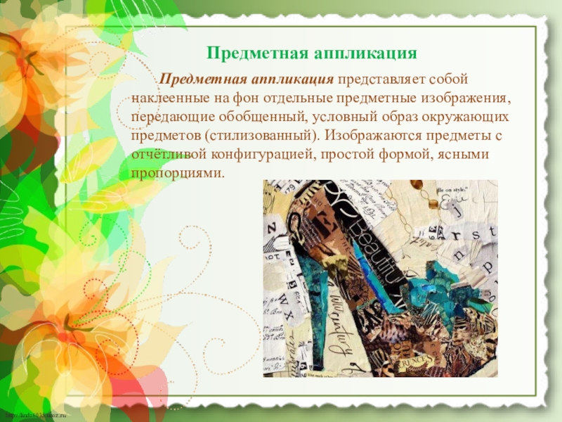 это способ работы с цветными кусочками различных материалов: бумаги, ткани, кожи, меха, войлока, цветные бусины, бисер, шерстяные нити, металлические чеканные платины, всевозможная материя (бархат, атлас, шёлк)., высушенных листьев … такое применение разнообразных материалов и структур с целью усиления выразительных возможностей очень близко к другому средству изображения - коллаж.