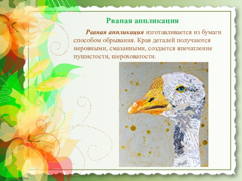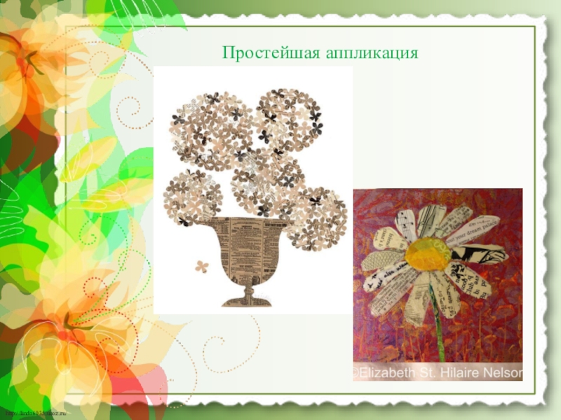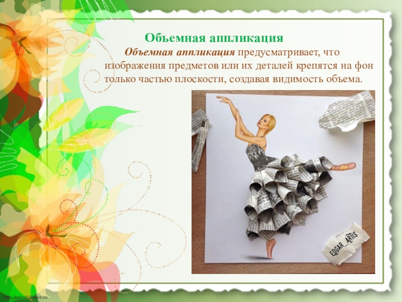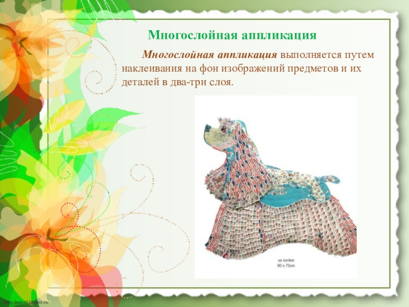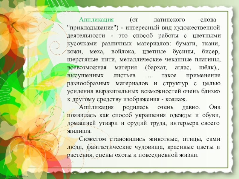 Аппликация родилась очень давно. Она появилась как способ украшения одежды и обуви, домашней утвари и орудий труда, интерьера своего жилища.