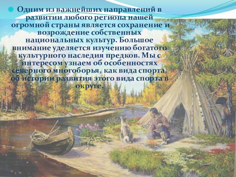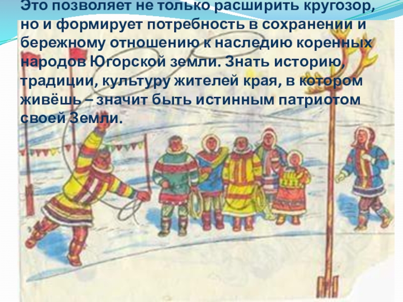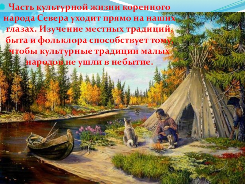 Изучение местных традиций, быта и фольклора способствует тому, чтобы культурные традиции малых народов не ушли в небытие.