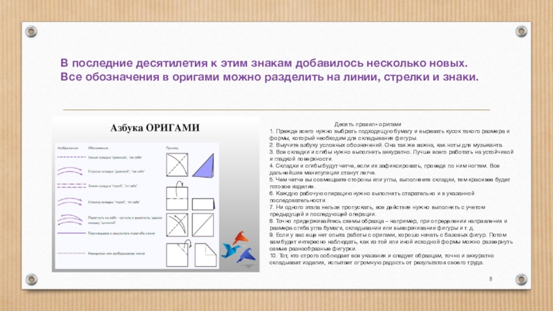 Все эти действия отмечены условными значками, стрелками, разработанными и утвержденными Японской ассоциацией оригами. Это азбука Оригами.