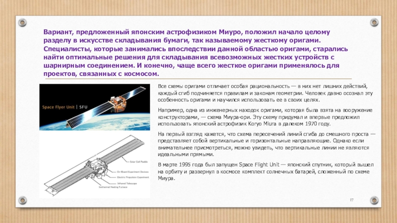 В марте 1995 года был запущен Space Flight Unit — японский спутник, который вышел на орбиту и развернул в космосе комплект солнечных батарей, сложенный по схеме Миура.