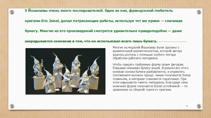 У Йошизавы очень много последователей. Один из них, французский любитель оригами Eric Joisel, делал потрясающие работы, используя тот же прием — смачивая бумагу. Многие из его произведений смотрятся удивительно правдоподобно — даже закрадывается сомнение в том, что он использовал всего лишь бумагу.