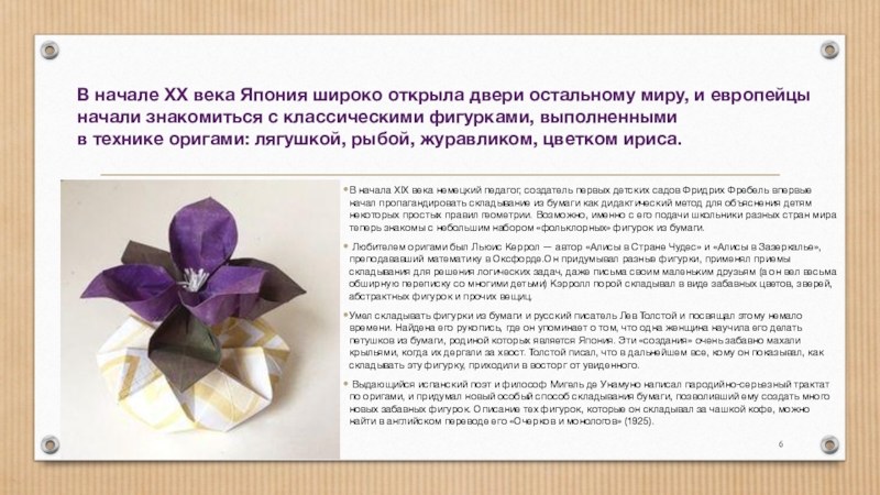 Любителем оригами был Льюис Керрол — автор «Алисы в Стране Чудес» и «Алисы в Зазеркалье», преподававший математику в Оксфорде.Он придумывал разные фигурки, применял приемы складывания для решения логических задач, даже письма своим маленьким друзьям (а он вел весьма обширную переписку со многими детьми) Кэрролл порой складывал в виде забавных цветов, зверей, абстрактных фигурок и прочих вещиц.