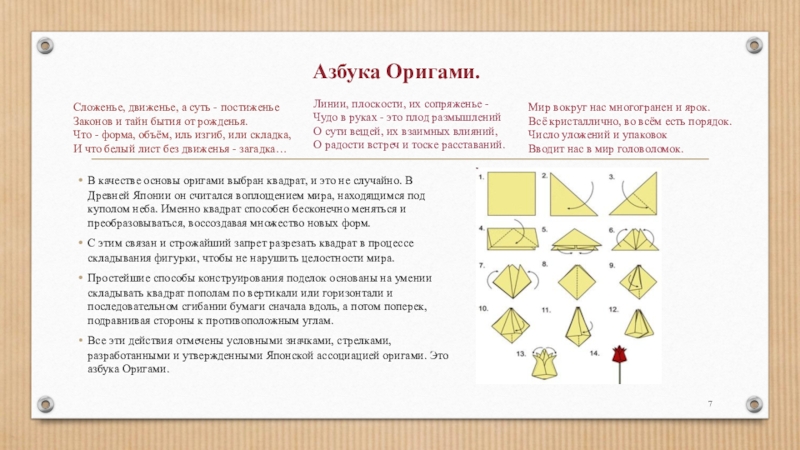 В качестве основы оригами выбран квадрат, и это не случайно. В Древней Японии он считался воплощением мира, находящимся под куполом неба. Именно квадрат способен бесконечно меняться и преобразовываться, воссоздавая множество новых форм.