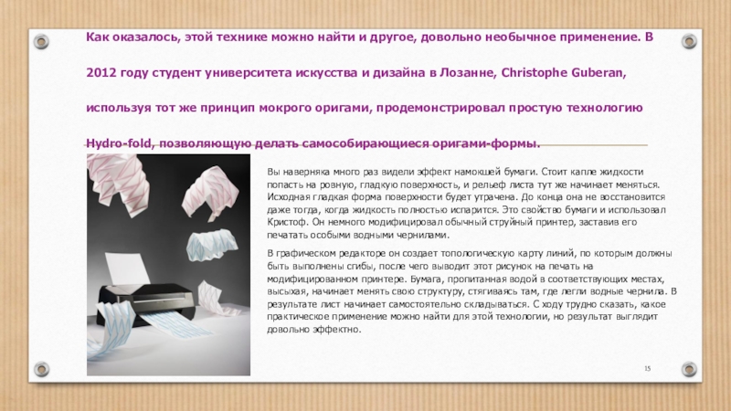 В графическом редакторе он создает топологическую карту линий, по которым должны быть выполнены сгибы, после чего выводит этот рисунок на печать на модифицированном принтере. Бумага, пропитанная водой в соответствующих местах, высыхая, начинает менять свою структуру, стягиваясь там, где легли водные чернила. В результате лист начинает самостоятельно складываться. С ходу трудно сказать, какое практическое применение можно найти для этой технологии, но результат выглядит довольно эффектно.