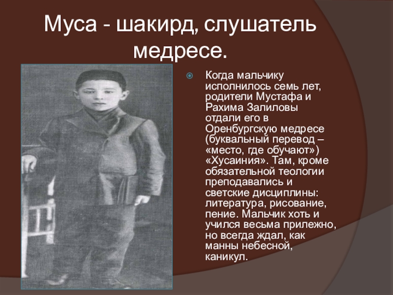 и Рахима Залиловы отдали его в Оренбургскую медресе (буквальный перевод – «место, где обучают») «Хусаиния». Там, кроме обязательной теологии преподавались и светские дисциплины: литература, рисование, пение. Мальчик хоть и учился весьма прилежно, но всегда ждал, как манны небесной, каникул.