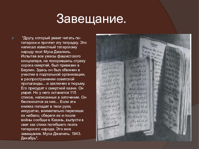 написал известный татарскому народу поэт Муса Джалиль. Испытав все ужасы фашистского концлагеря, не покорившись страху сорока смертей, был привезен в Берлин. Здесь он был обвинен в участии в подпольной организации, в распространении советской пропаганды... и заключен в тюрьму. Его присудят к смертной казни. Он умрет. Но у него останется 115 стихов, написанных в заточении. Он беспокоится за них... Если эта книжка попадет в твои руки, аккуратно, внимательно перепиши их набело, сбереги их и после войны сообщи в Казань, выпусти в свет как стихи погибшего поэта татарского народа. Это мое завещание. Муса Джалиль. 1943. Декабрь".