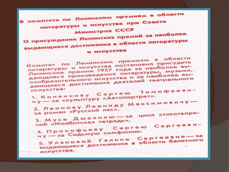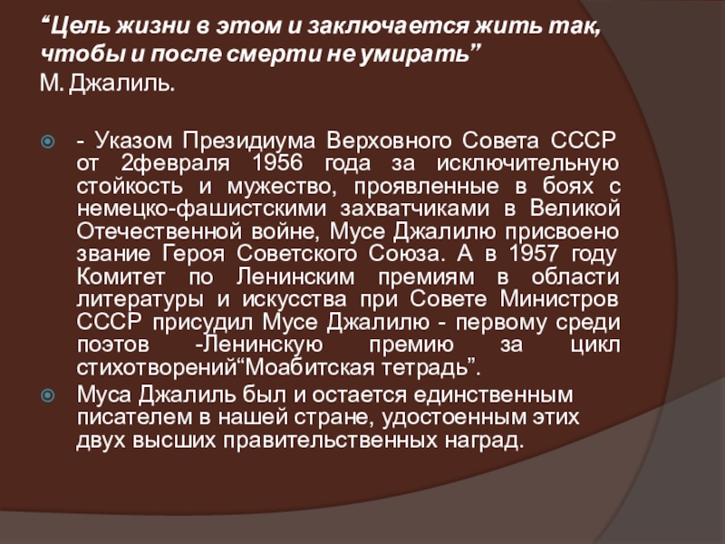 - Указом Президиума Верховного Совета СССР от 2февраля 1956 года за исключительную стойкость и мужество, проявленные в боях с немецко-фашистскими захватчиками в Великой Отечественной войне, Мусе Джалилю присвоено звание Героя Советского Союза. А в 1957 году Комитет по Ленинским премиям в области литературы и искусства при Совете Министров СССР присудил Мусе Джалилю - первому среди поэтов -Ленинскую премию за цикл стихотворений“Моабитская тетрадь”.