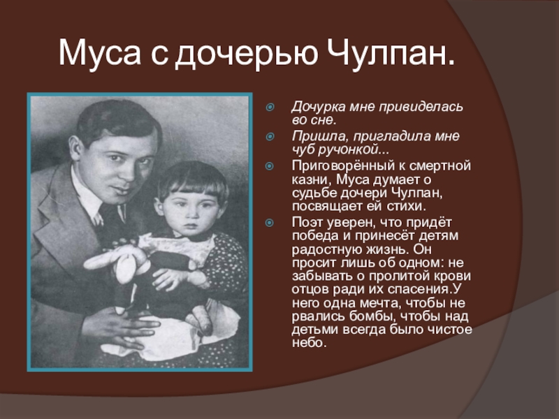 Приговорённый к смертной казни, Муса думает о судьбе дочери Чулпан, посвящает ей стихи.