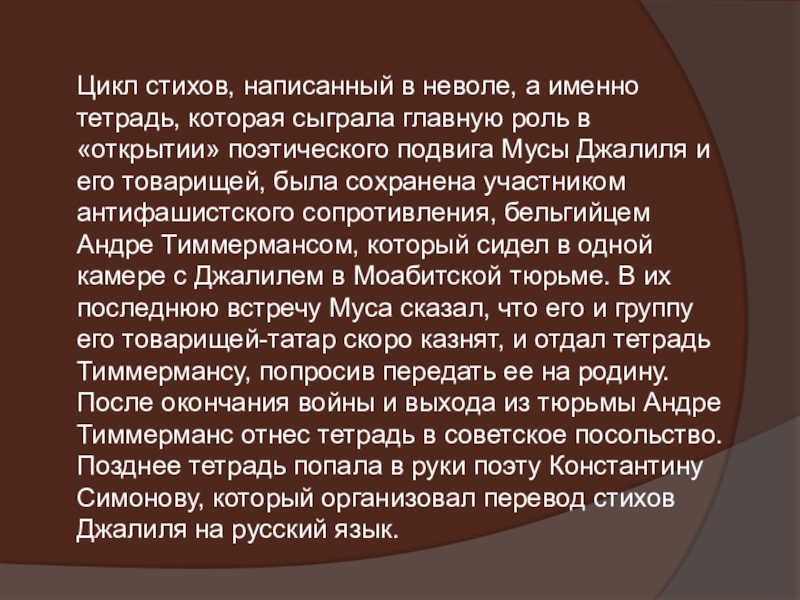 роль в «открытии» поэтического подвига Мусы Джалиля и его товарищей, была сохранена участником антифашистского сопротивления, бельгийцем Андре Тиммермансом, который сидел в одной камере с Джалилем в Моабитской тюрьме. В их последнюю встречу Муса сказал, что его и группу его товарищей-татар скоро казнят, и отдал тетрадь Тиммермансу, попросив передать ее на родину. После окончания войны и выхода из тюрьмы Андре Тиммерманс отнес тетрадь в советское посольство. Позднее тетрадь попала в руки поэту Константину Симонову, который организовал перевод стихов Джалиля на русский язык.