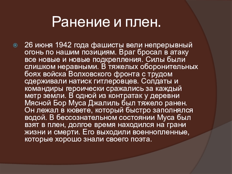 нашим позициям. Враг бросал в атаку все новые и новые подкрепления. Силы были слишком неравными. В тяжелых оборонительных боях войска Волховского фронта с трудом сдерживали натиск гитлеровцев. Солдаты и командиры героически сражались за каждый метр земли. В одной из контратак у деревни Мясной Бор Муса Джалиль был тяжело ранен. Он лежал в кювете, который быстро заполнялся водой. В бессознательном состоянии Муса был взят в плен, долгое время находился на грани жизни и смерти. Его выходили военнопленные, которые хорошо знали своего поэта.