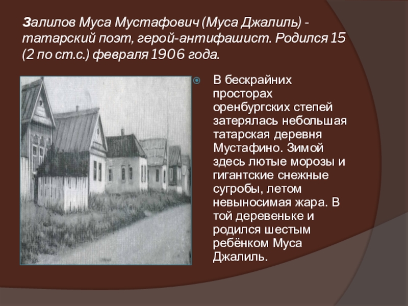 Слайд 8Залилов Муса Мустафович (Муса Джалиль) - татарский поэт, герой-антифашист. Родился 15