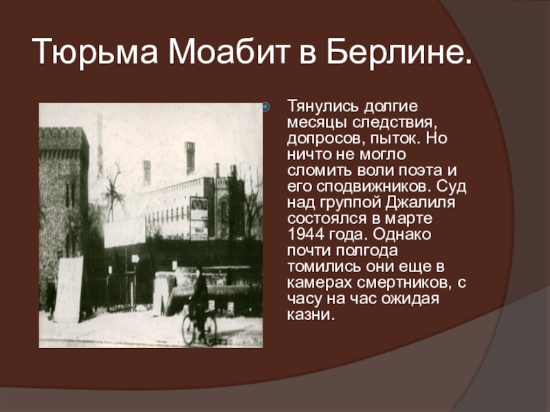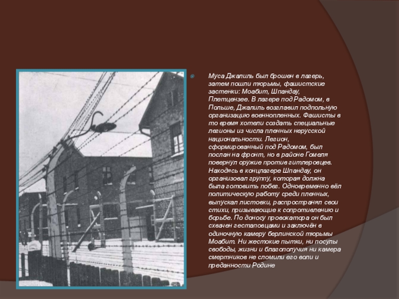 Слайд 18Муса Джалиль был брошен в лагерь, затем пошли тюрьмы, фашистские застенки: