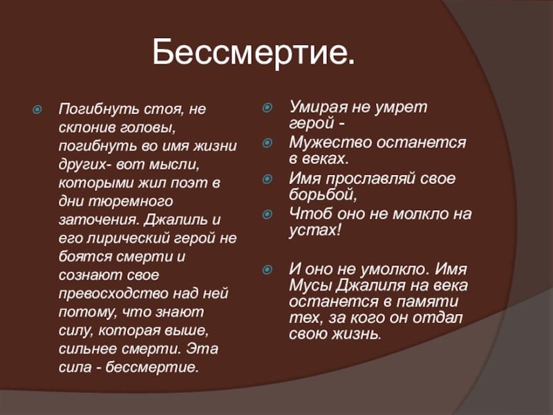 мысли, которыми жил поэт в дни тюремного заточения. Джалиль и его лирический герой не боятся смерти и сознают свое превосходство над ней потому, что знают силу, которая выше, сильнее смерти. Эта сила - бессмертие.