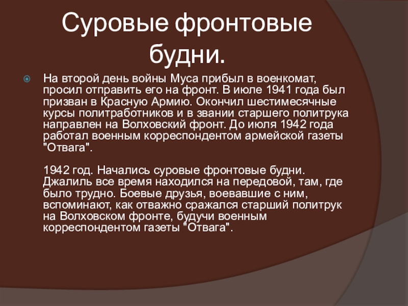 1942 год. Начались суровые фронтовые будни. Джалиль все время находился на передовой, там, где было трудно. Боевые друзья, воевавшие с ним, вспоминают, как отважно сражался старший политрук на Волховском фронте, будучи военным корреспондентом газеты "Отвага".