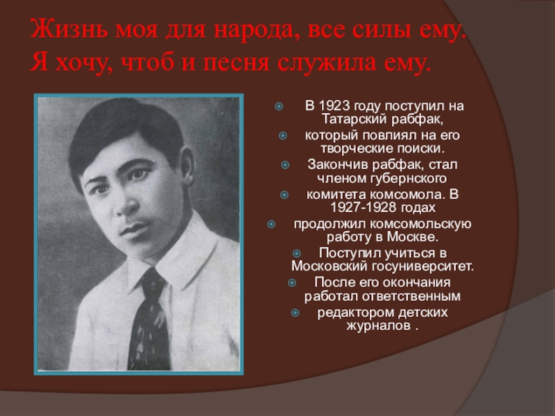 В 1923 году поступил на Татарский рабфак,