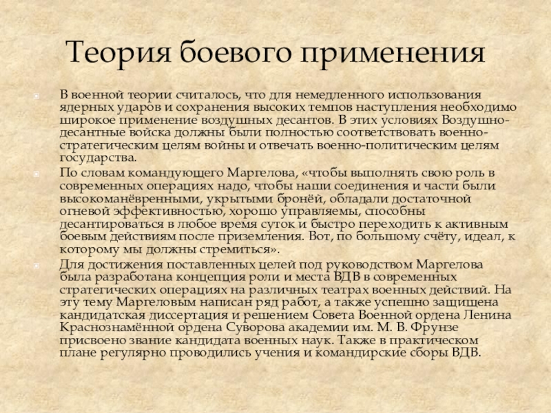 Для достижения поставленных целей под руководством Маргелова была разработана концепция роли и места ВДВ в современных стратегических операциях на различных театрах военных действий. На эту тему Маргеловым написан ряд работ, а также успешно защищена кандидатская диссертация и решением Совета Военной ордена Ленина Краснознамённой ордена Суворова академии им. М. В. Фрунзе присвоено звание кандидата военных наук. Также в практическом плане регулярно проводились учения и командирские сборы ВДВ.