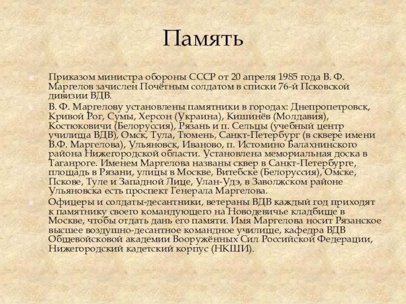 Маргелов зачислен Почётным солдатом в списки 76-й Псковской дивизии ВДВ.