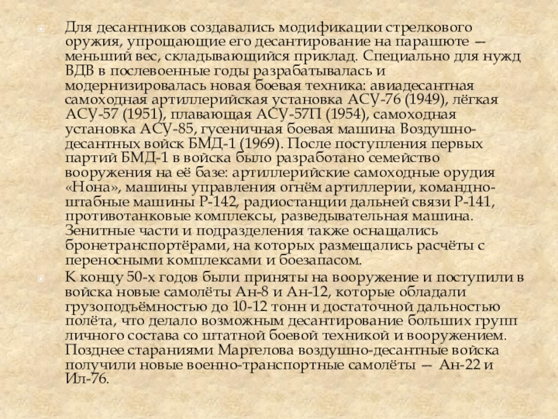 организационной структурой войск, а также возможностями военно-транспортной авиации. Вступив в должность командующего, Маргелов получил войска, состоящие, в основном, из пехоты с лёгким вооружением и военно-транспортной авиации в качестве составной части ВДВ, которая была оснащена самолётами Ли-2, Ил-14, Ту-2 и Ту-4 с существенно ограниченными десантными возможностями. Фактически ВДВ не были способны решать крупные задачи в военных операциях.