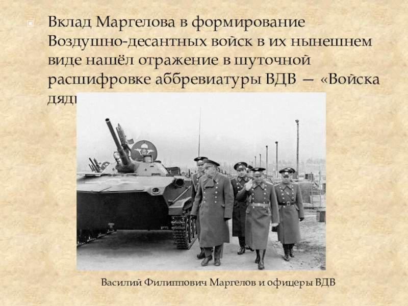 Слайд 11Вклад Маргелова в формирование Воздушно-десантных войск в их нынешнем виде нашёл