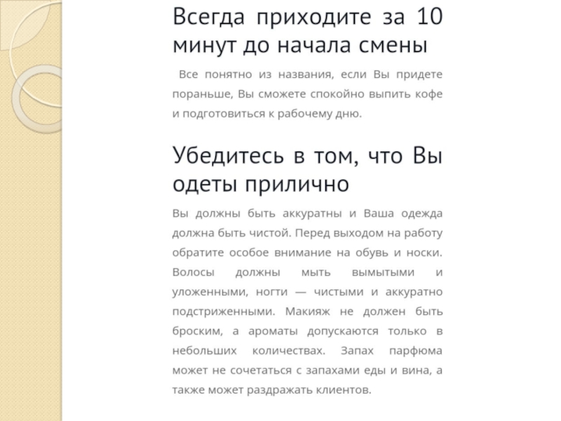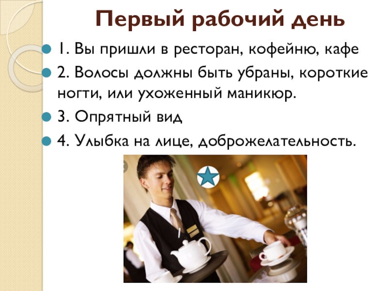 Первый рабочий день1. Вы пришли в ресторан, кофейню, кафе2. Волосы должны быть убраны, короткие ногти, или ухоженный