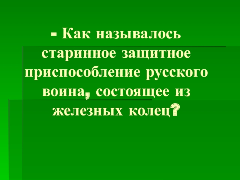 Слайд 9- Как называлось старинное защитное приспособление русского воина, состоящее из железных