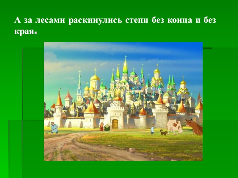 Слайд 3А за лесами раскинулись степи без конца и без края.