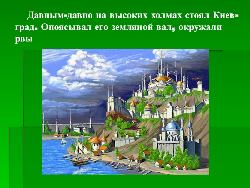 Слайд 2 Давным-давно на высоких холмах стоял Киев-град. Опоясывал его земляной вал, окружали