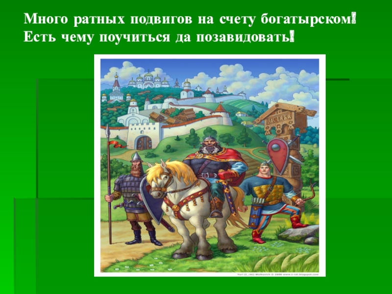 Слайд 5Много ратных подвигов на счету богатырском! Есть чему поучиться да позавидовать!