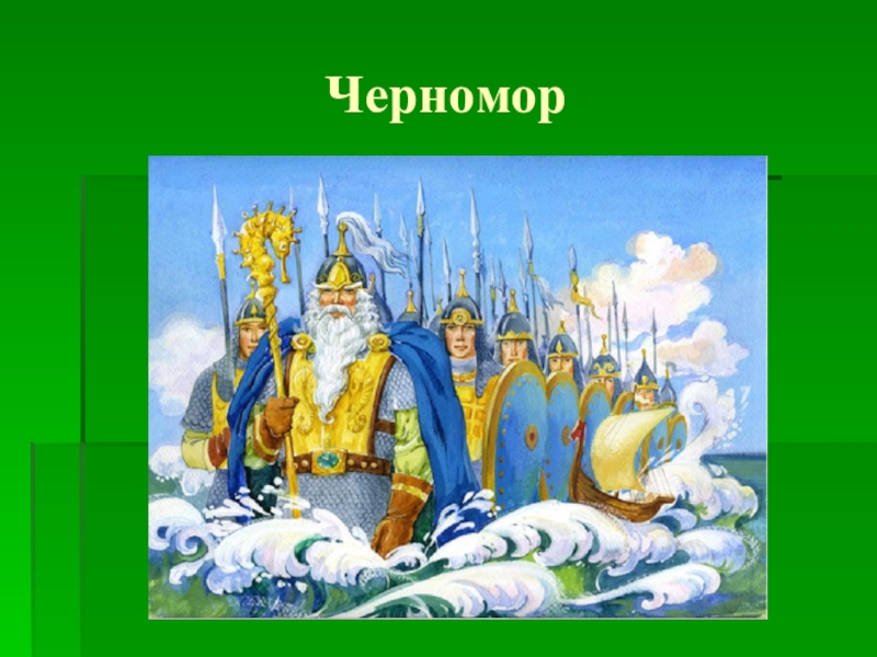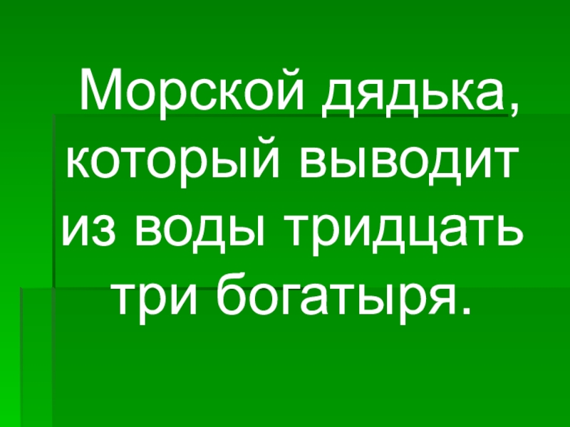 Слайд 13 Морской дядька, который выводит из воды тридцать три богатыря.
