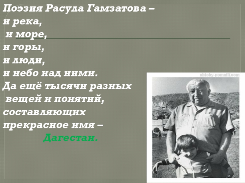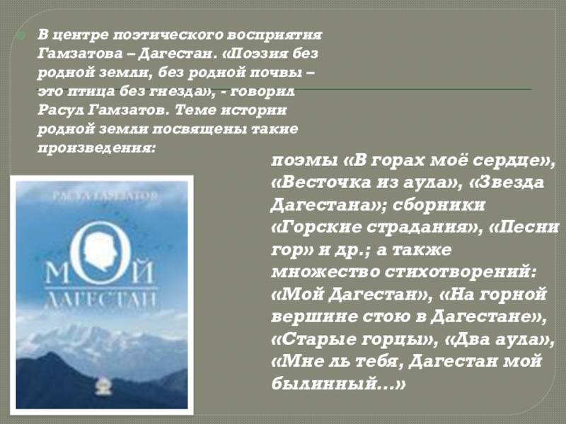 Слайд 5В центре поэтического восприятия Гамзатова – Дагестан. «Поэзия без родной земли,