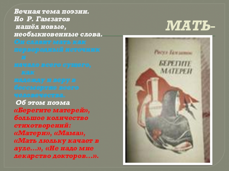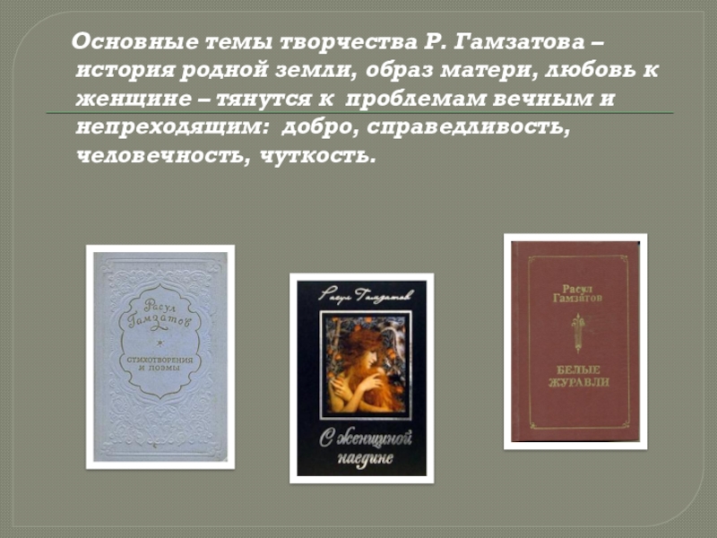 Слайд 12 Основные темы творчества Р. Гамзатова – история родной земли,