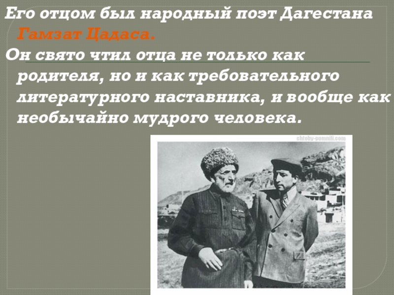 Слайд 8Его отцом был народный поэт Дагестана Гамзат Цадаса.