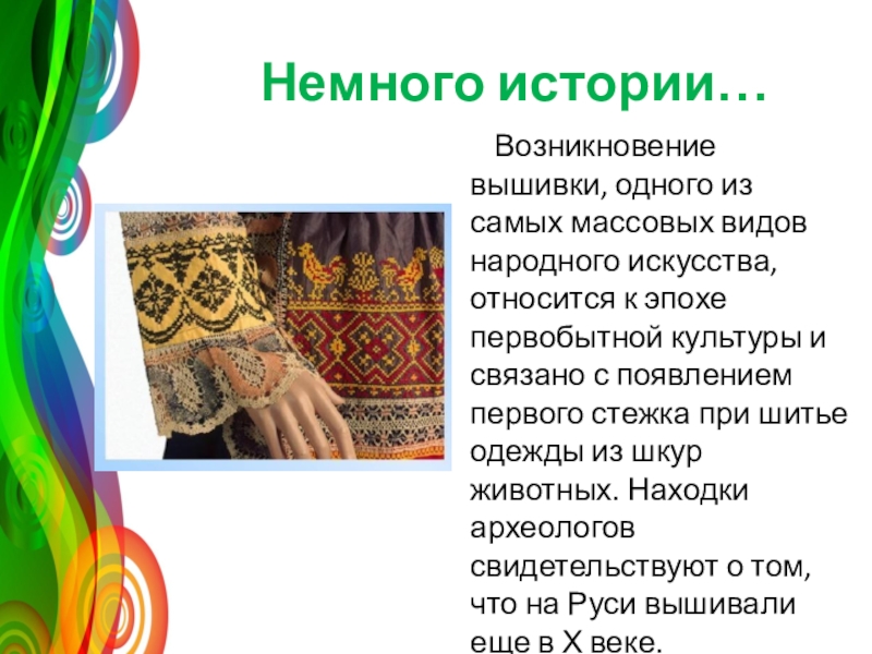 Возникновение вышивки, одного из самых массовых видов народного искусства, относится к эпохе первобытной культуры и связано с появлением первого стежка при шитье одежды из шкур животных. Находки археологов свидетельствуют о том, что на Руси вышивали еще в Х веке.