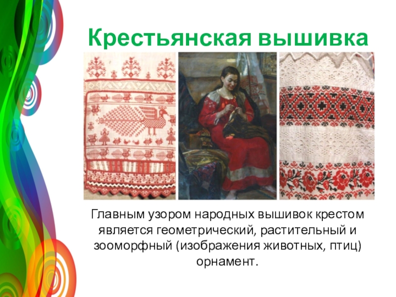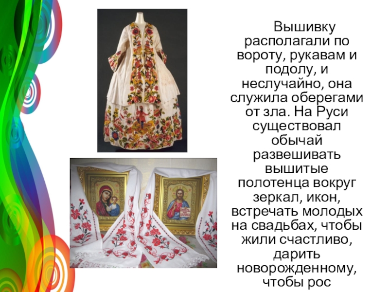 подолу, и неслучайно, она служила оберегами от зла. На Руси существовал обычай развешивать вышитые полотенца вокруг зеркал, икон, встречать молодых на свадьбах, чтобы жили счастливо, дарить новорожденному, чтобы рос здоровым.