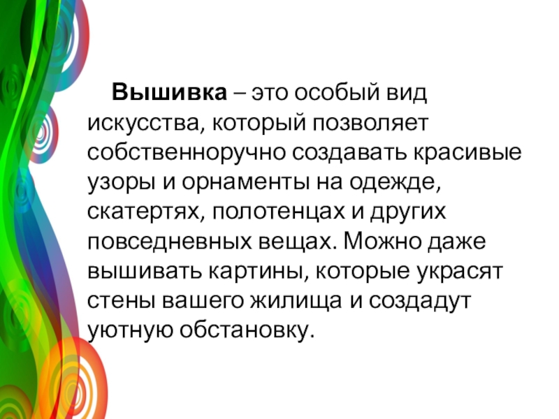 позволяет собственноручно создавать красивые узоры и орнаменты на одежде, скатертях, полотенцах и других повседневных вещах. Можно даже вышивать картины, которые украсят стены вашего жилища и создадут уютную обстановку.