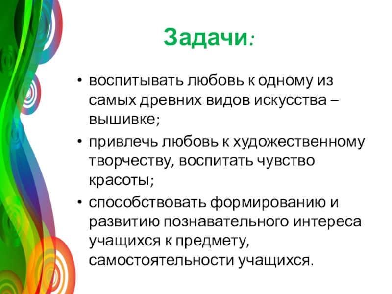 привлечь любовь к художественному творчеству, воспитать чувство красоты;