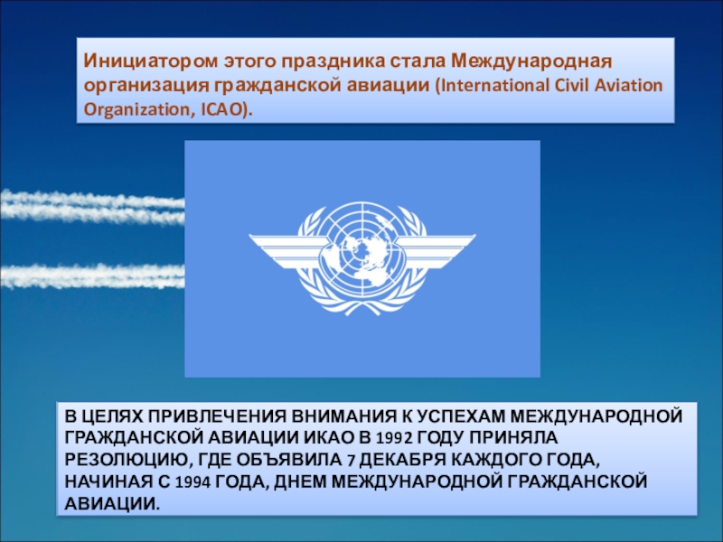 Инициатором этого праздника стала Международная организация гражданской авиации (International Civil Aviation Organization, ICAO).