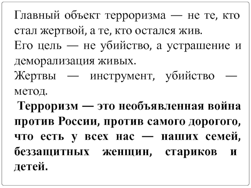 Слайд 10Главный объект терроризма — не те, кто стал жертвой, а те,