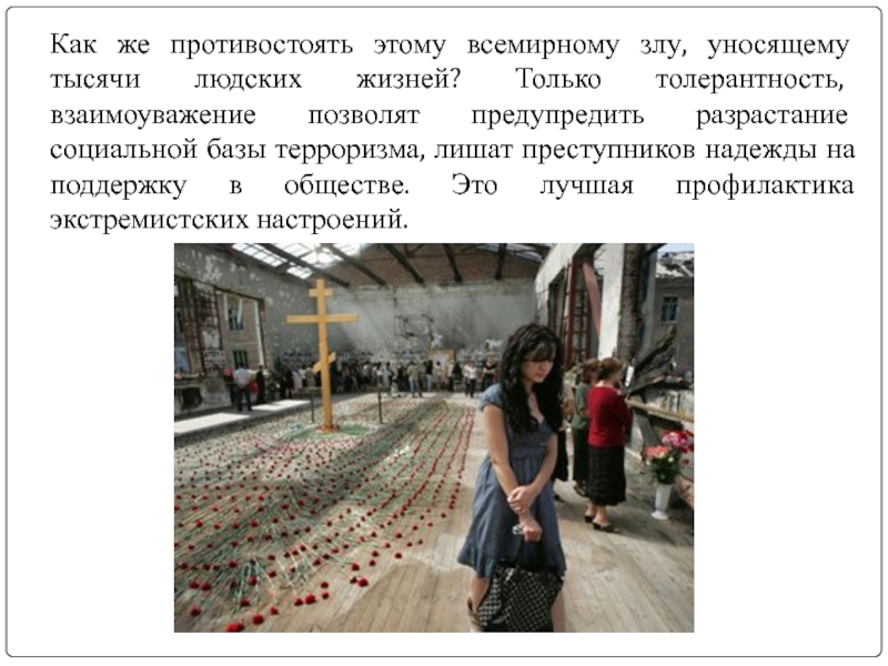 толерантность, взаимоуважение позволят предупредить разрастание социальной базы терроризма, лишат преступников надежды на поддержку в обществе. Это лучшая профилактика экстремистских настроений.