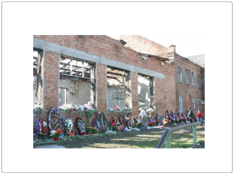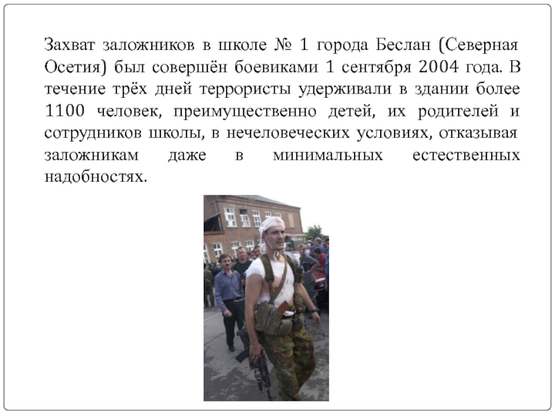 совершён боевиками 1 сентября 2004 года. В течение трёх дней террористы удерживали в здании более 1100 человек, преимущественно детей, их родителей и сотрудников школы, в нечеловеческих условиях, отказывая заложникам даже в минимальных естественных надобностях.